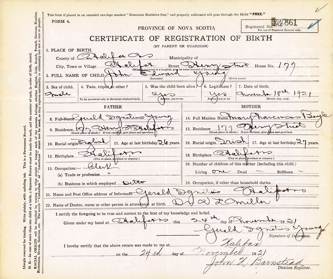 21. Name and Post Office address of Informant Gerald Dgnatius Halifax, NS
