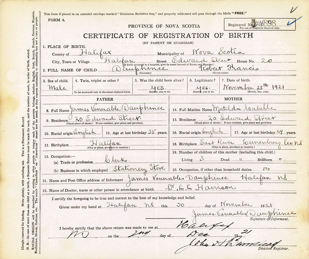 21. Name and Post Office address of Informant James Venerable Dauphinee Halifax