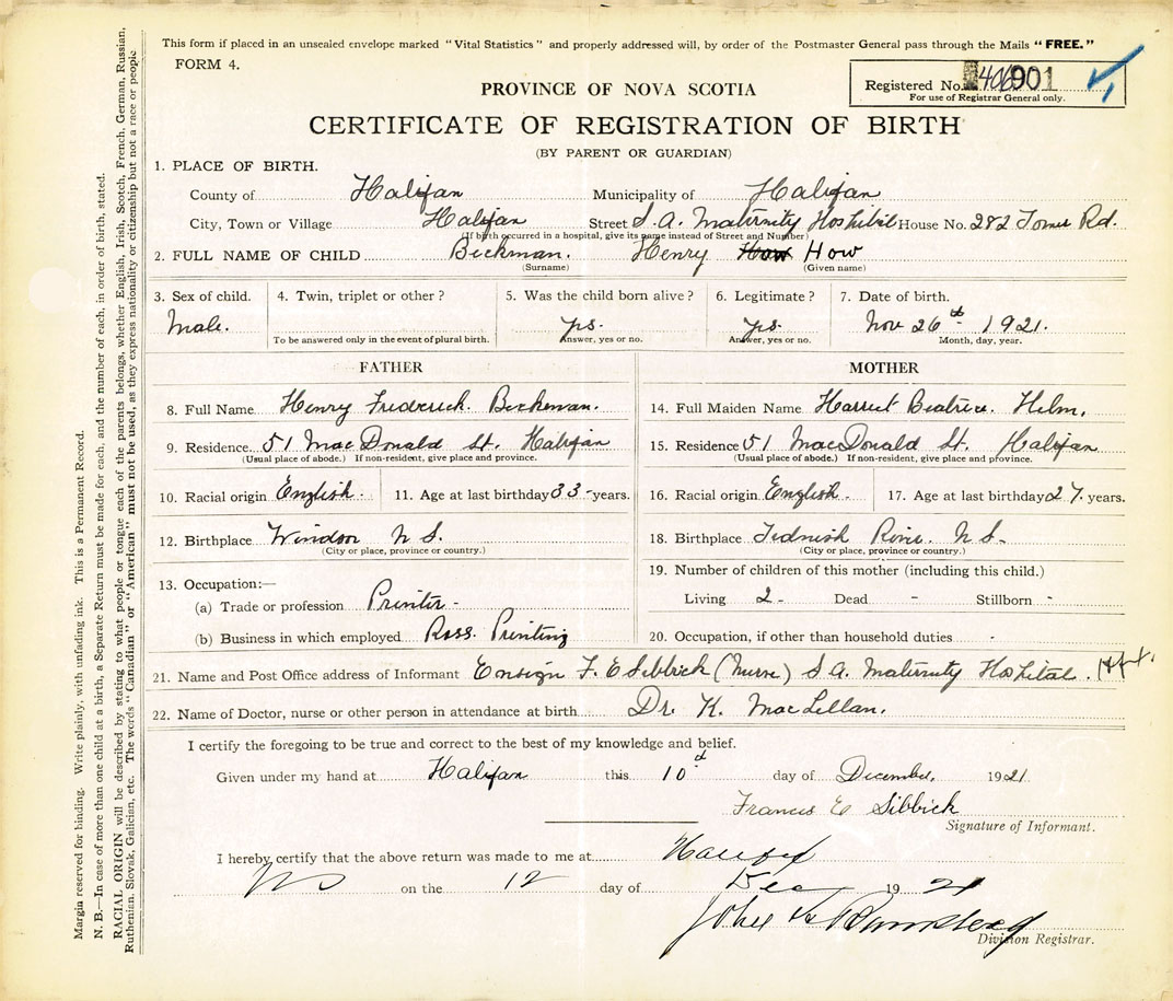 21. Name and Post Office address of Informant Ensign F.E. Liblick (nurse) S.A. Maternity Hospital, Halifax