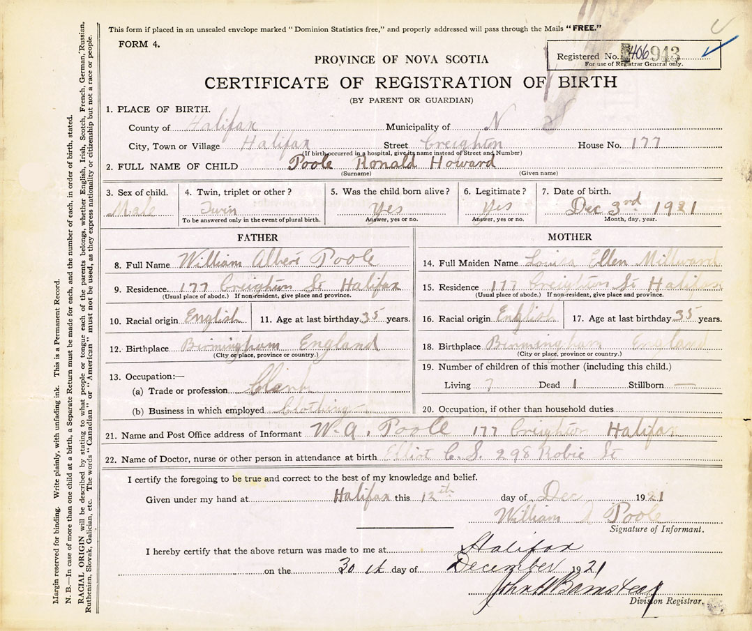 21. Name and Post Office address of Informant William A. Poole 177 Creighton, Halifax