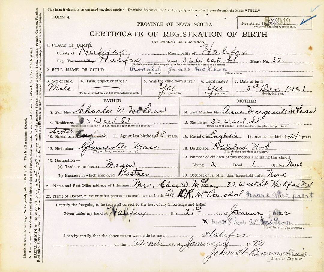 21. Name and Post Office address of Informant Mrs. Charles W. McLean 32 West St, Halifax