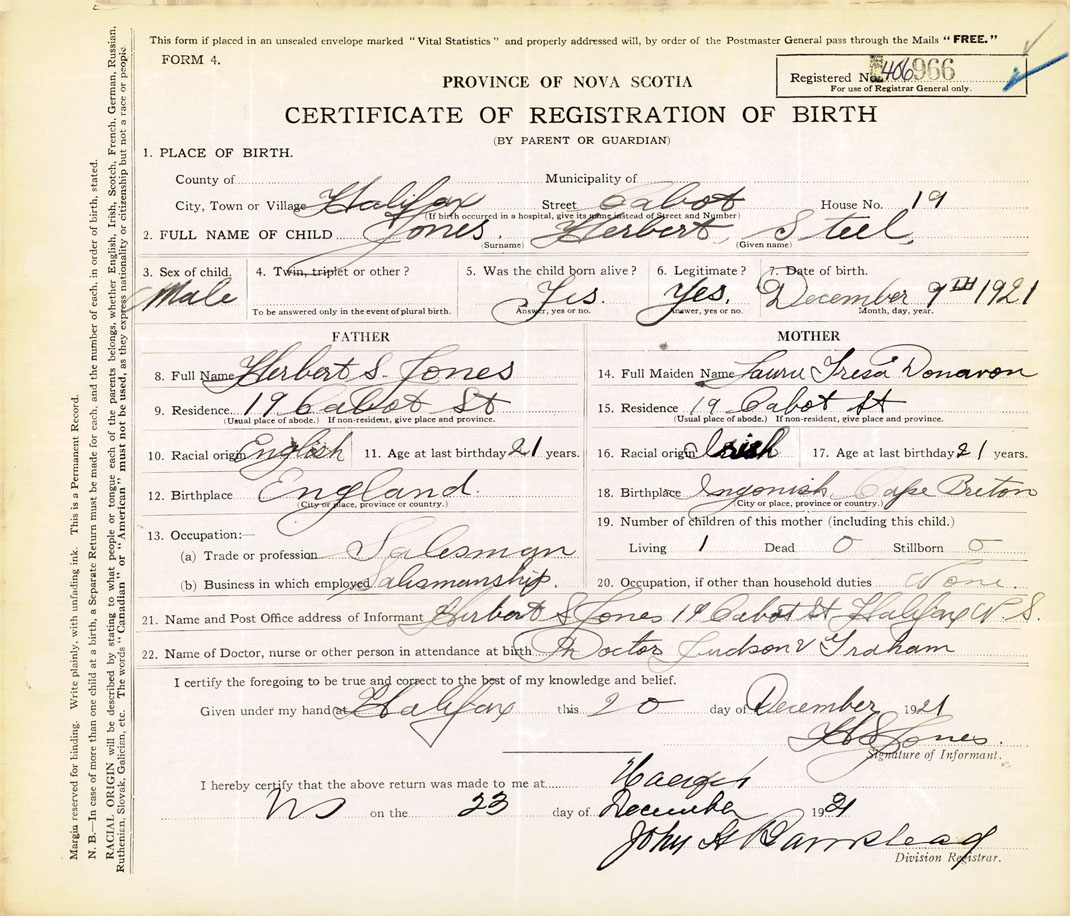 21. Name and Post Office address of Informant Herbert S. Jones 19 Cabot St., Halifax