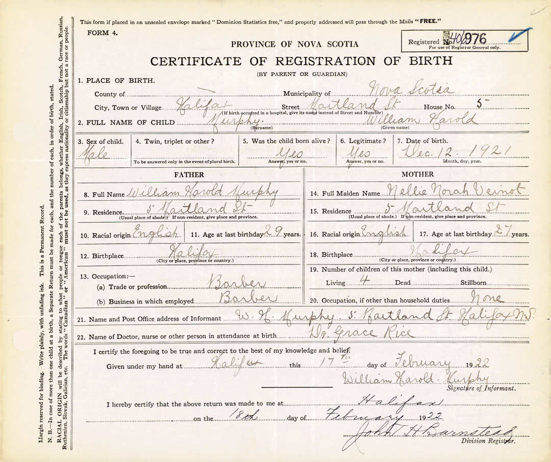 21. Name and Post Office address of Informant William Harold Murphy 5 Maitland St., Halifax