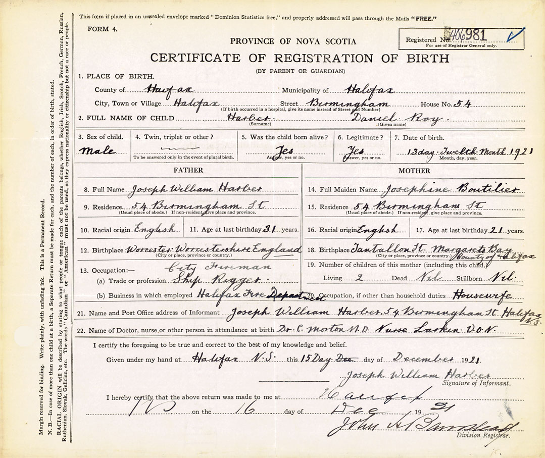 21. Name and Post Office address of Informant Joseph William Harber 54 Birmingham St. Halifax, NS