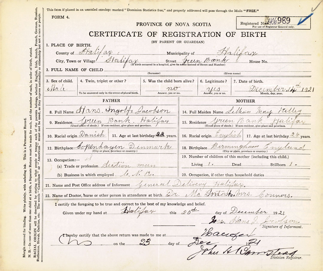 21. Name and Post Office address of Informant Mrs. Hans I. Jacobson General Delivery, Halifax