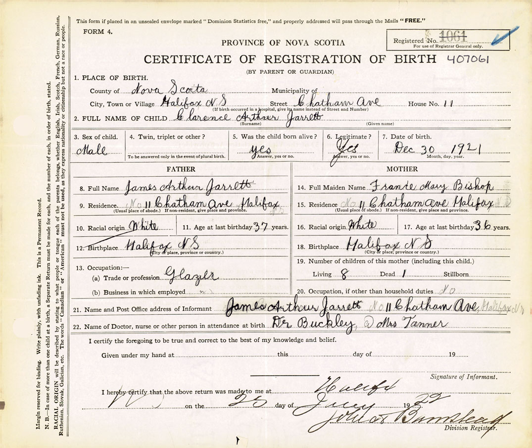 21. Name and Post Office address of Informant James Arthur Jarrett No. 11 Chatham Ave, Halifax