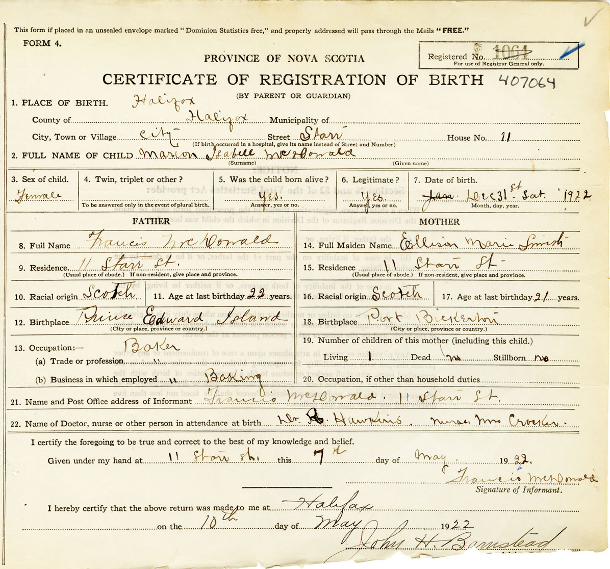 21. Name and Post Office address of Informant Francis McDonald 11 Starr St. Halifax