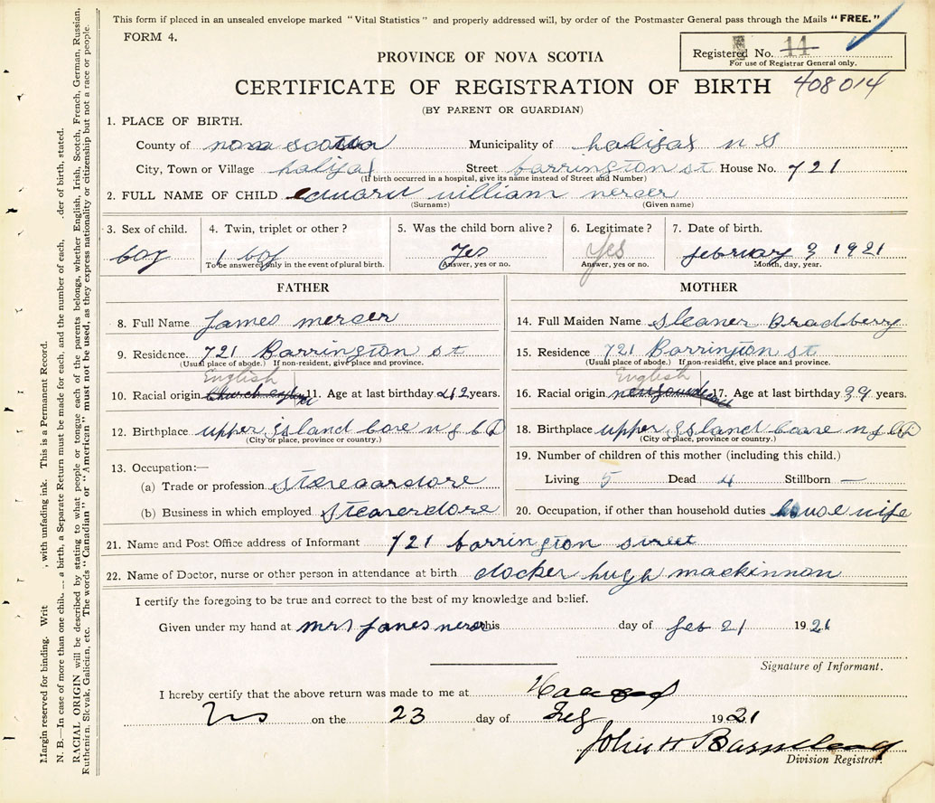 21. Name and Post Office address of Informant Mrs. James Mercer 721 Barrington Street