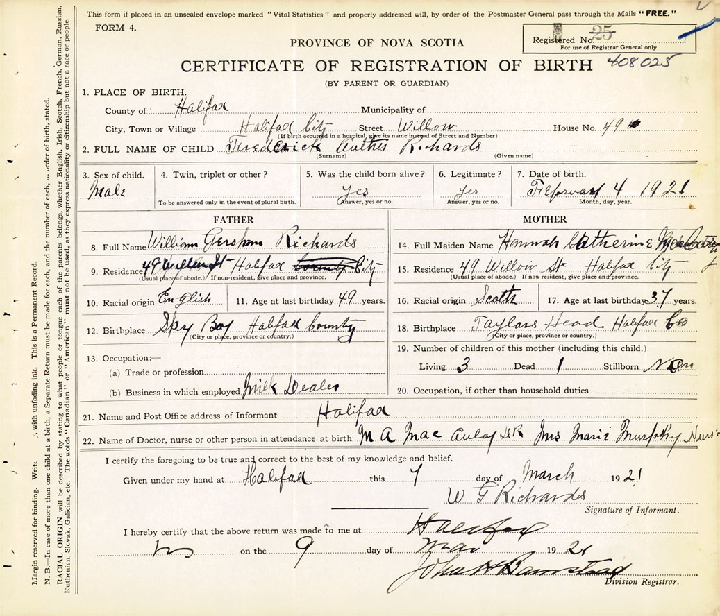 21. Name and Post Office address of Informant W. G. Richards Halifax