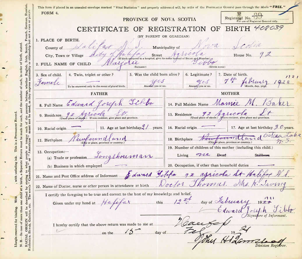 21. Name and Post Office address of Informant Edward Tibbo 92 Agricola St., Halifax