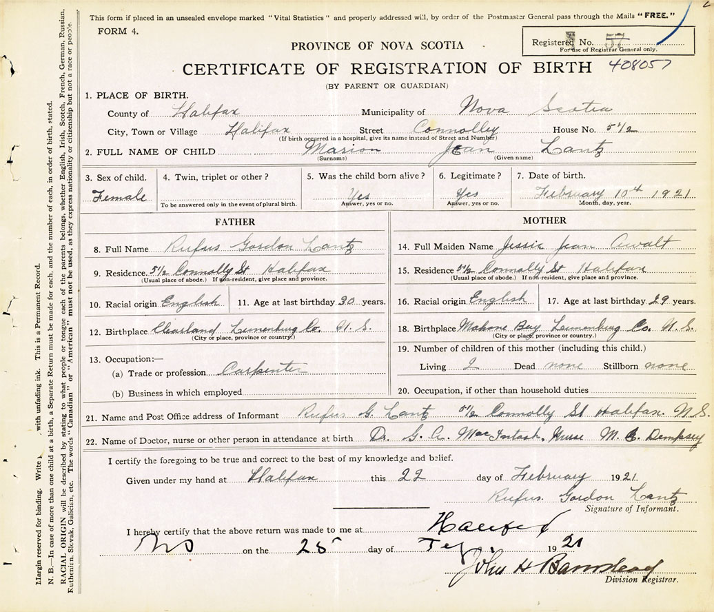 21. Name and Post Office address of Informant Rufus Gordon Lantz 5 1/2 Connolly St., Halifax