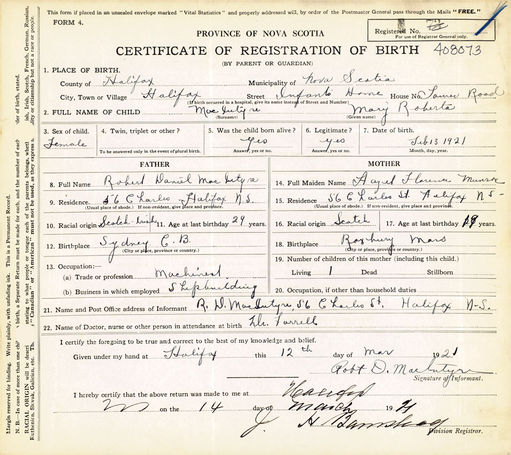 21. Name and Post Office address of Informant Robt. D. MacIntyre 56 Charles St., Halifax