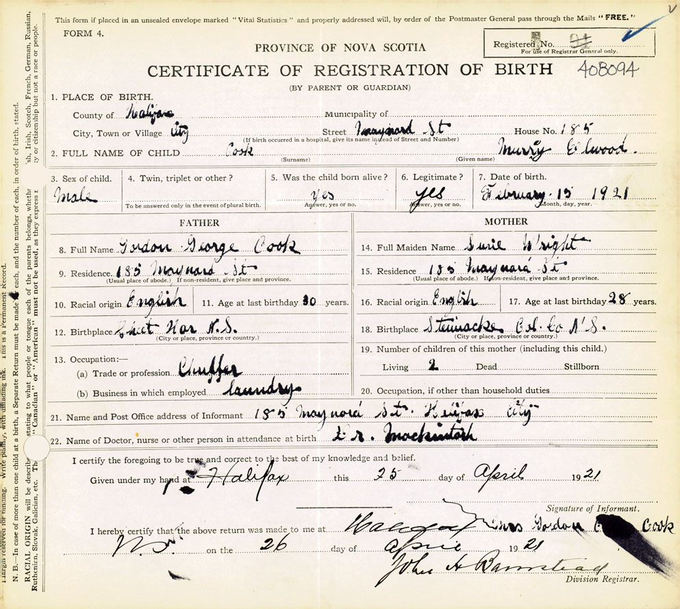 21. Name and Post Office address of Informant Mrs. Gordon Cook 135 Maynard St., Halifax City