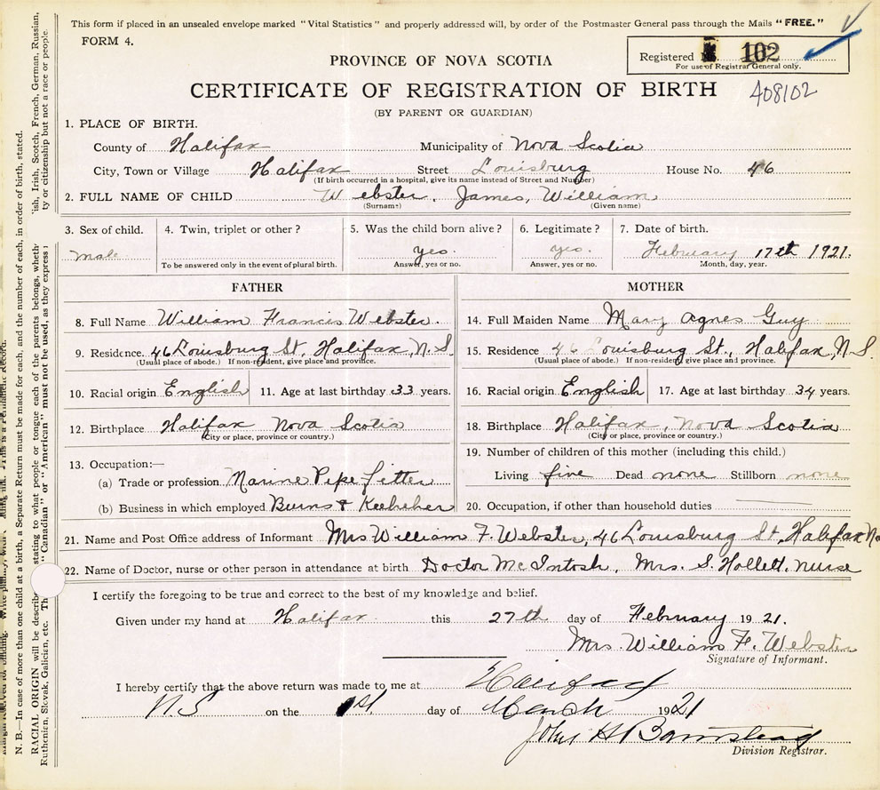21. Name and Post Office address of Informant Mrs. William F. Webster 46 Louisburg St., Halifax