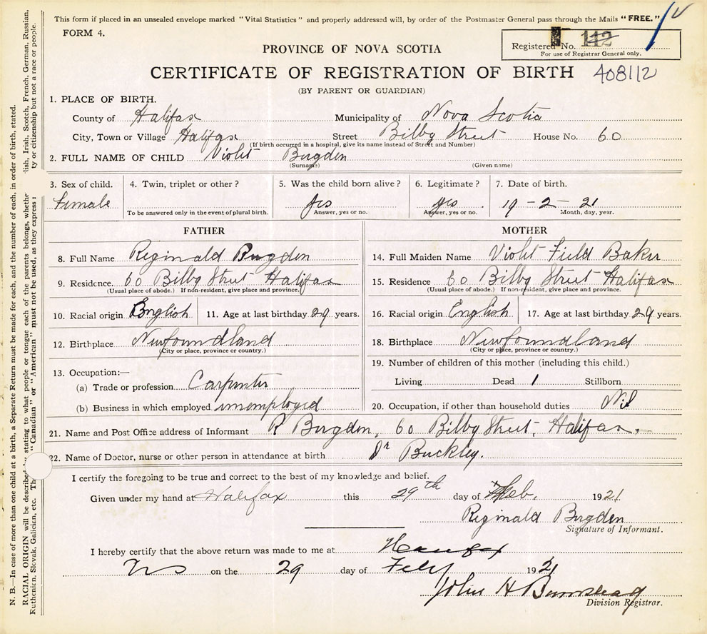 21. Name and Post Office address of Informant Reginald Bugden 60 Bilby Street, Halifax