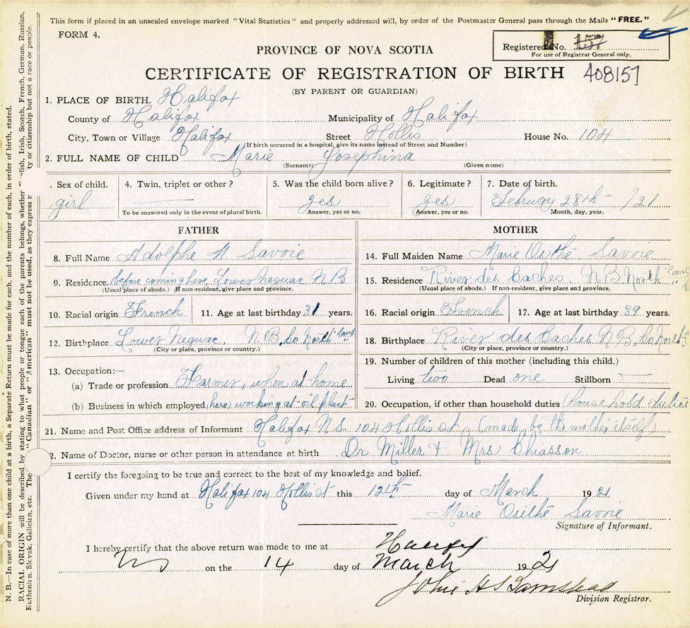 21. Name and Post Office address of Informant Marie Osithe Savoie Halifax, N.S., 104 Hollis St. (made by the mother itself)