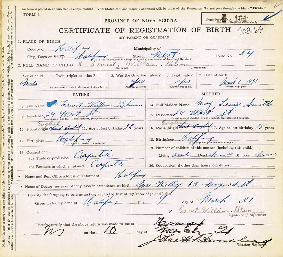 21. Name and Post Office address of Informant Earnest William Blum Halifax