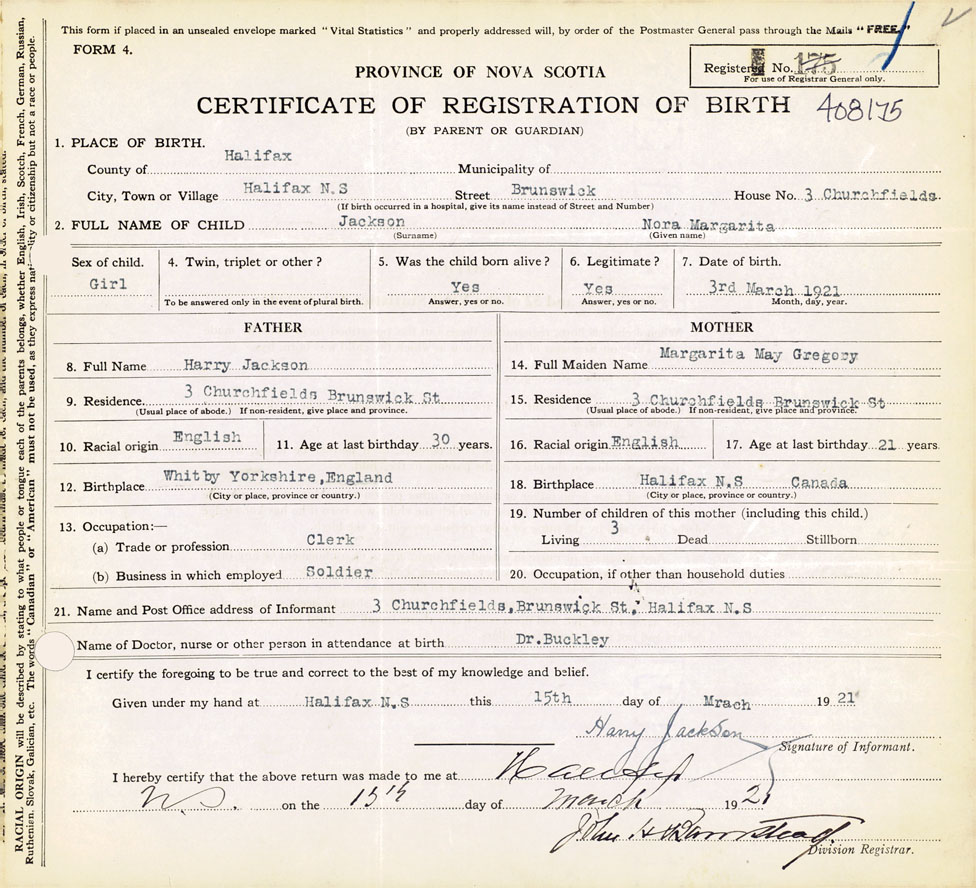 21. Name and Post Office address of Informant Harry Jackson 3 Churchfields, Brunswick St., Halifax