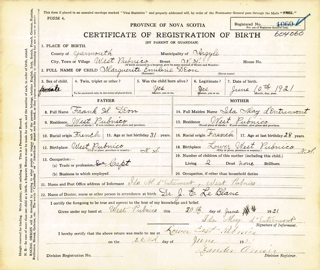 21. Name and Post Office address of Informant Ida M. d'Entremont West Pubnico