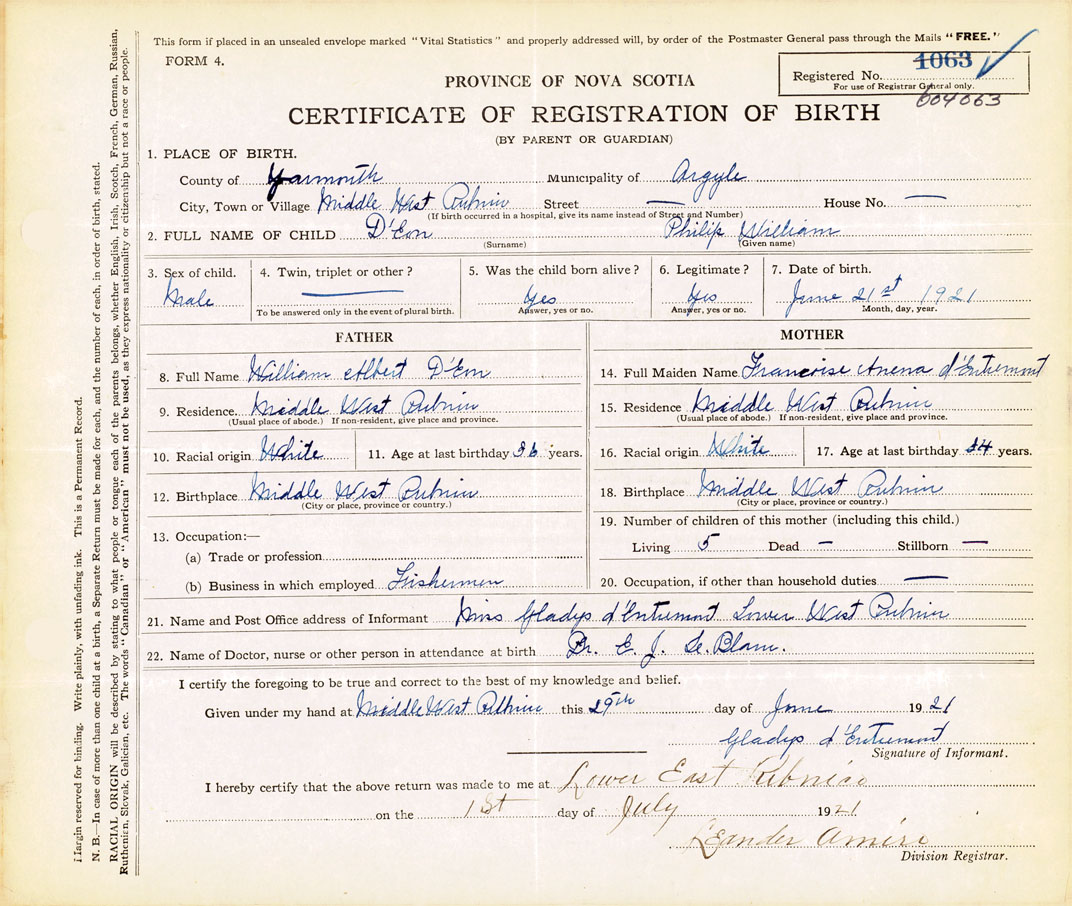 21. Name and Post Office address of Informant Miss. Gladys d'Entremont Lower West Pubnico, Yarmouth