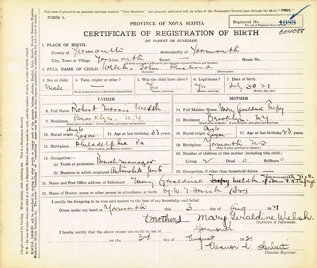 21. Name and Post Office address of Informant Mary Geraldine Welsh c/o Mrs. F. R. Trefry, Yarmouth