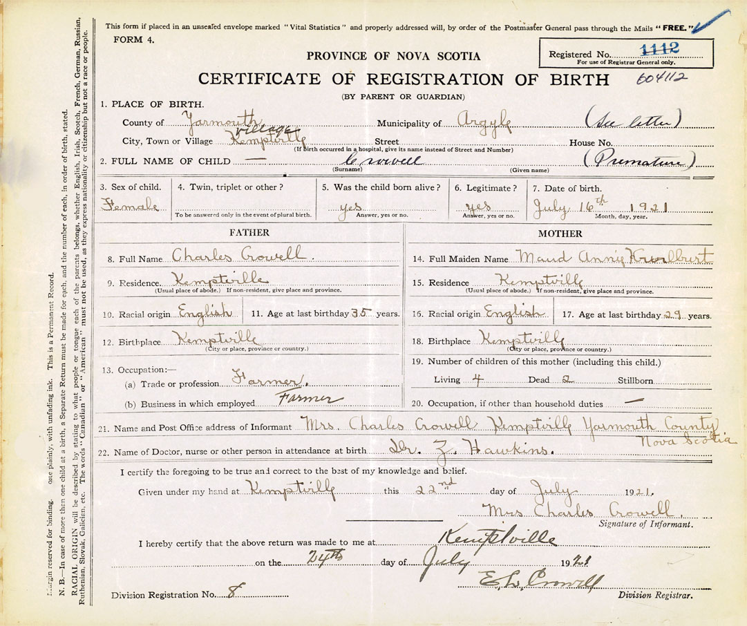 21. Name and Post Office address of Informant Mrs. Charles Crowell Kemptville, Yarmouth County