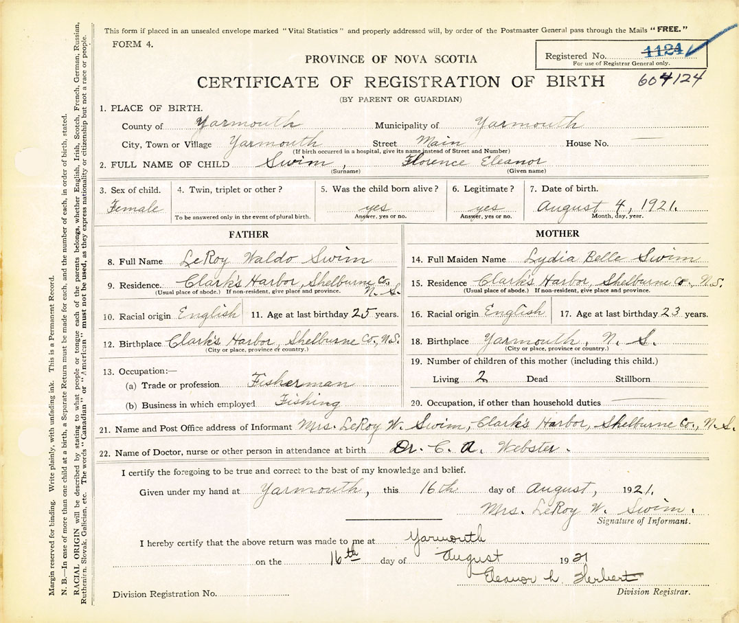 21. Name and Post Office address of Informant Mrs. LeRoy W. Swim Clarks Harbour, Shelburne