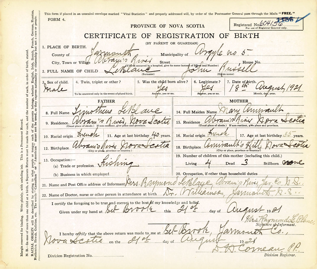 21. Name and Post Office address of Informant Mrs. Raymond LeBlanc Abrams River, Yar.