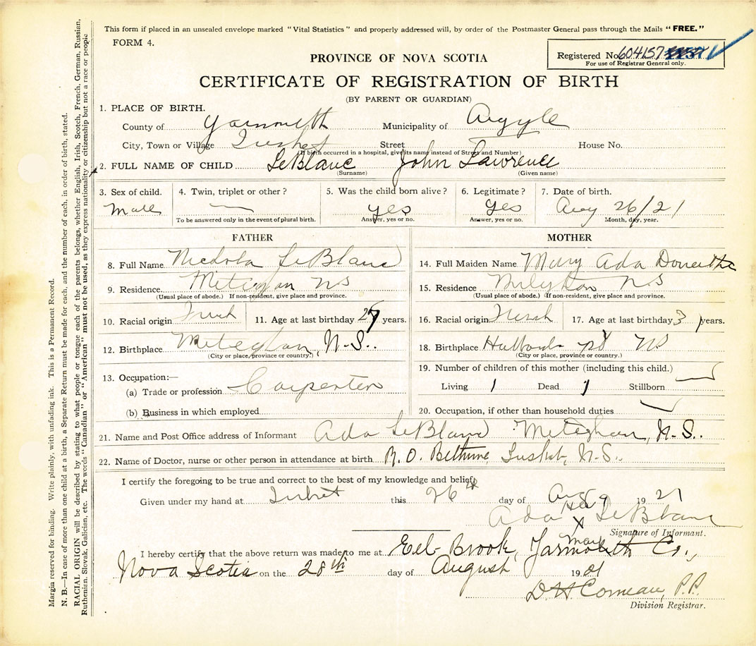 21. Name and Post Office address of Informant Ada LeBlanc Meteghan