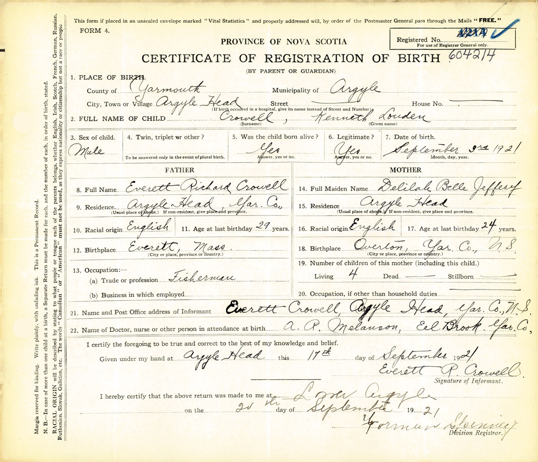 21. Name and Post Office address of Informant Everett Crowell Argyle Head, Yarmouth County