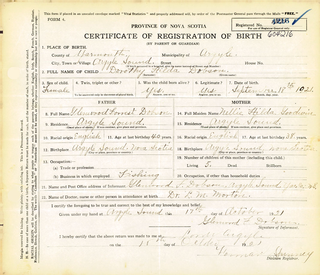 21. Name and Post Office address of Informant Glenwood F. Dobson Argyle Sound, Yar.
