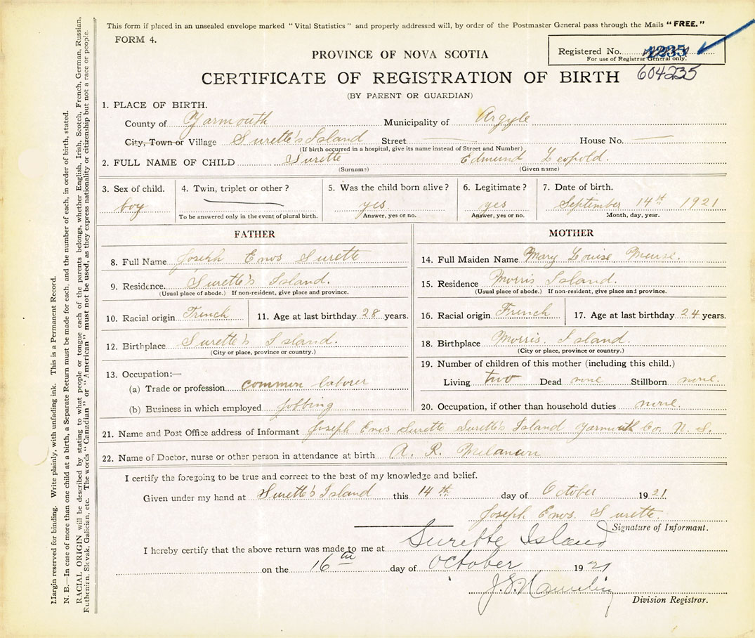 21. Name and Post Office address of Informant Joseph Enos Surette Surettes Island, Yarmouth