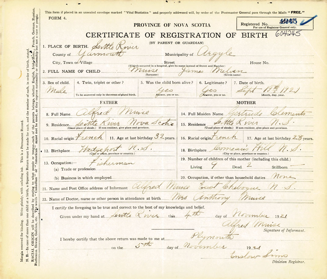 21. Name and Post Office address of Informant Alfred Muise East Chebogue