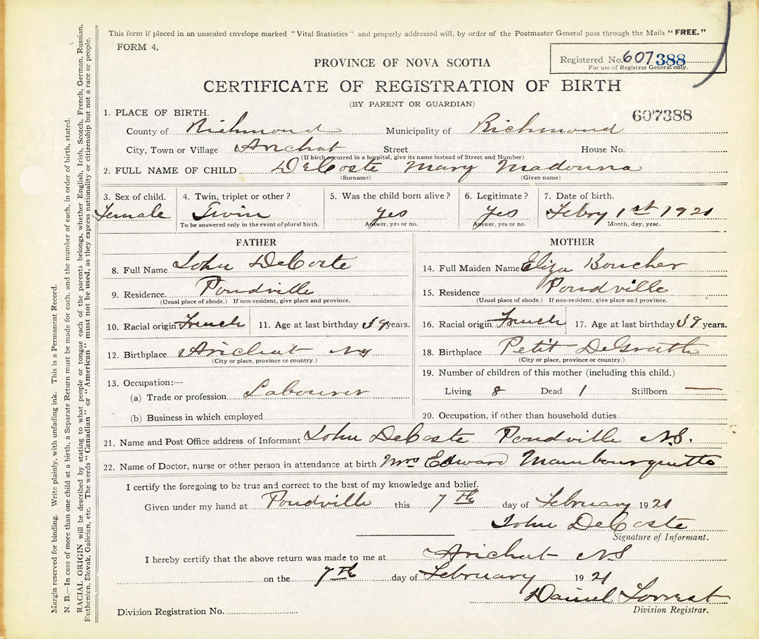 Note: Mother's maiden name in first twin is Bouchie not Boucher - previous record. Nova Scotia Archives Historical Vital Statistics Births 1921-60700387