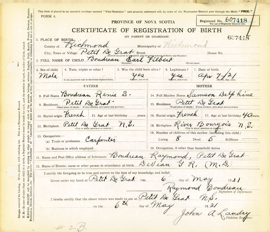 2. FULL NAME OF CHILD Boudreau, Earl Filbert