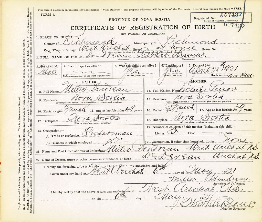 22. Name of Doctor, nurse or other person in attendance at birth Dr. Deveau Arichat
