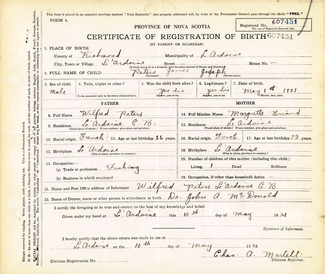 21. Name and Post Office address of Informant Wilfred Peters L'Ardoise, C.B.