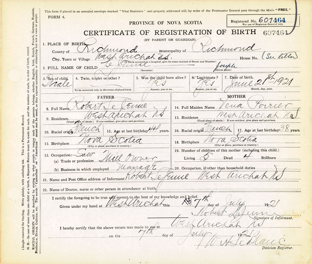 21. Name and Post Office address of Informant Robert LeJeune West Arichat