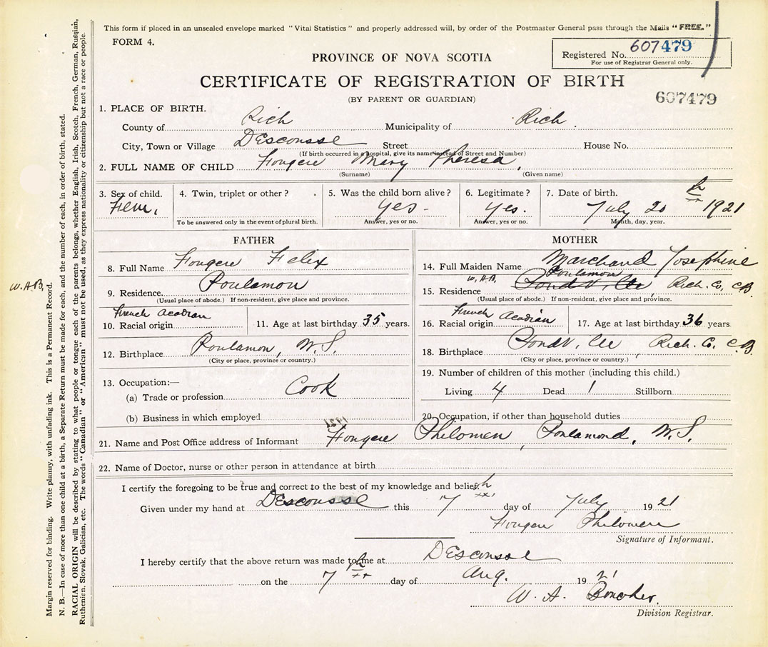 21. Name and Post Office address of Informant Philomen Fougere Poulamond