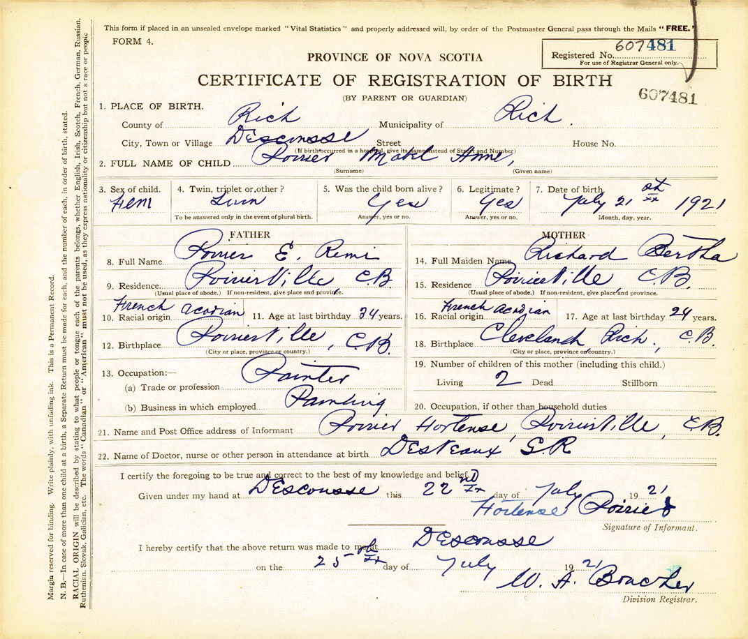 21. Name and Post Office address of Informant Hortense Poirier PoirierVille, C.B.