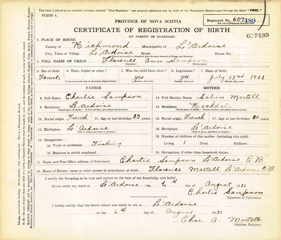 22. Name of Doctor, nurse or other person in attendance at birth Florence Martell L'Ardoise, C.B.