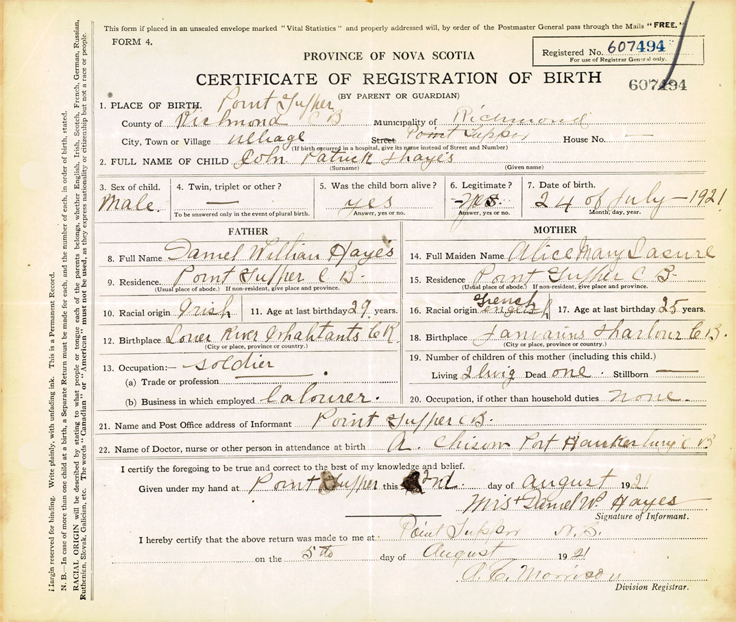 21. Name and Post Office address of Informant Mrs. Daniel W. Hayes Point Tupper, C.B.