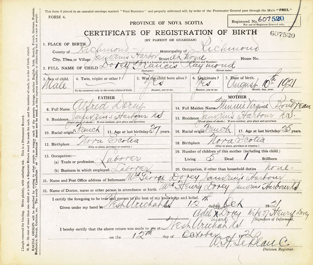 21. Name and Post Office address of Informant Mrs. George Dorey Janvrins Harbour