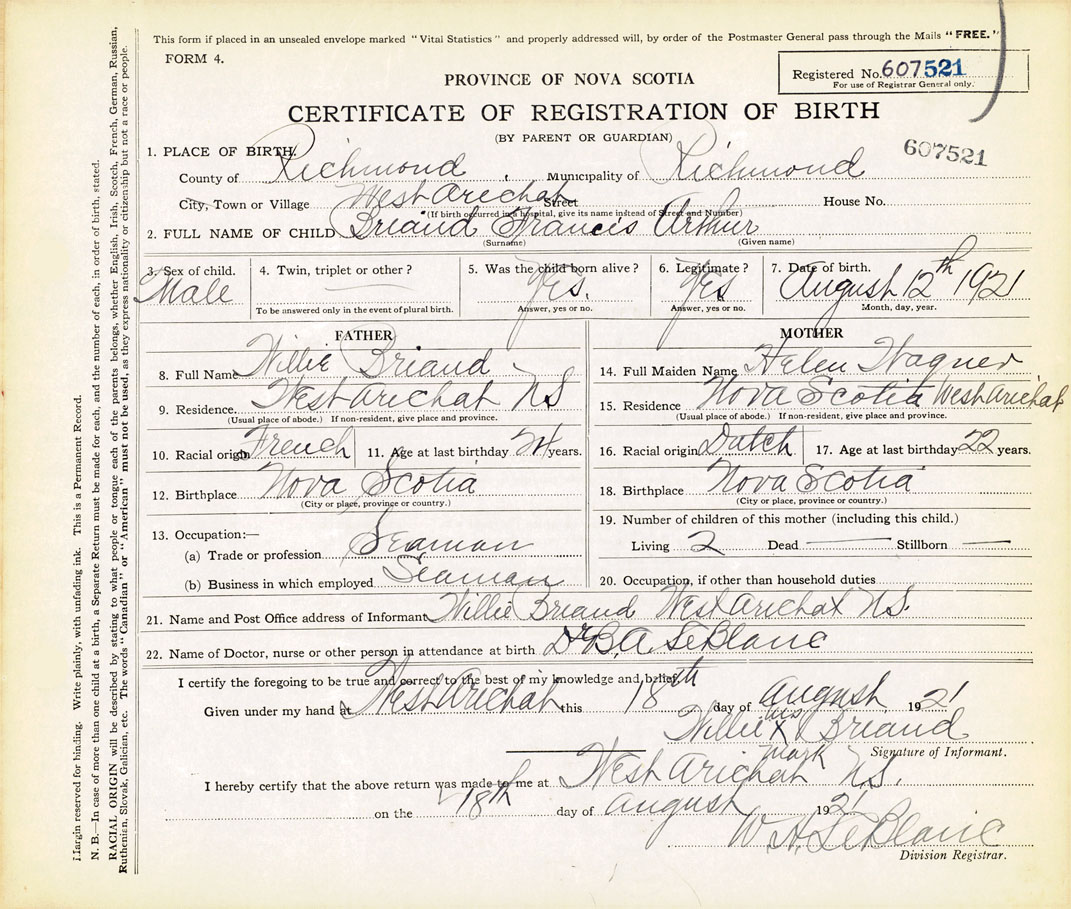 21. Name and Post Office address of Informant Willie Briand West Arichat