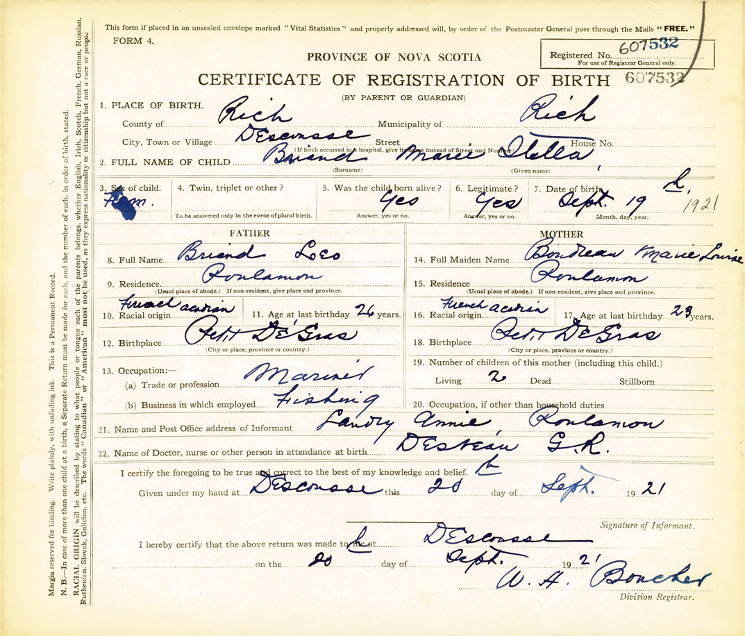 10. Racial Origin French Acadian | 11. Age at last birthday 26