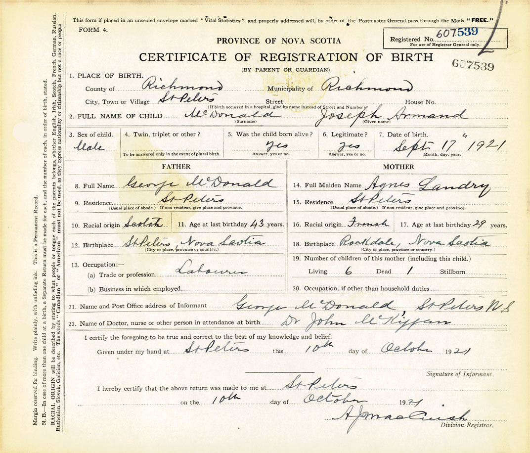 21. Name and Post Office address of Informant George McDonald St Peter's, NS