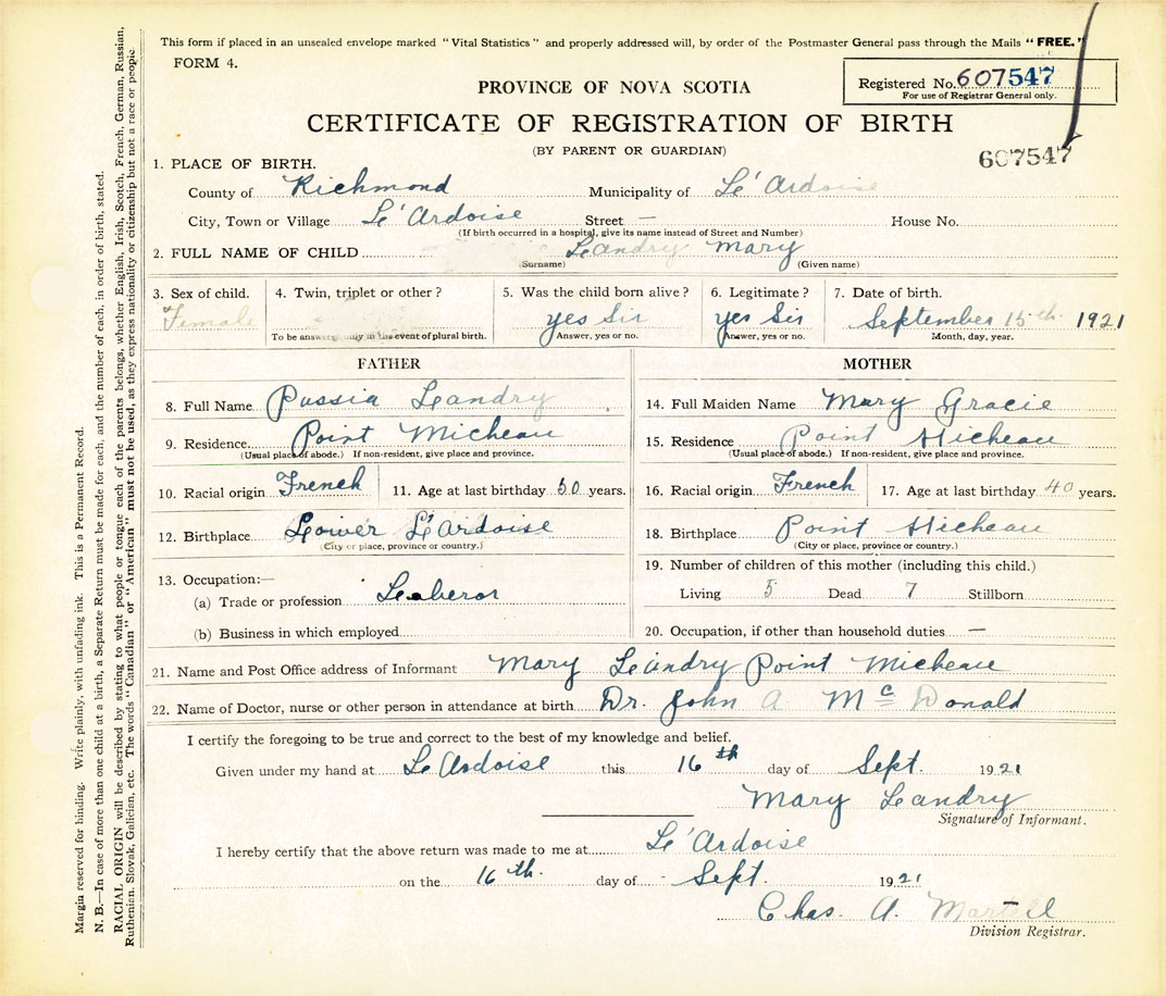 21. Name and Post Office address of Informant Mary Landry Point Micheau