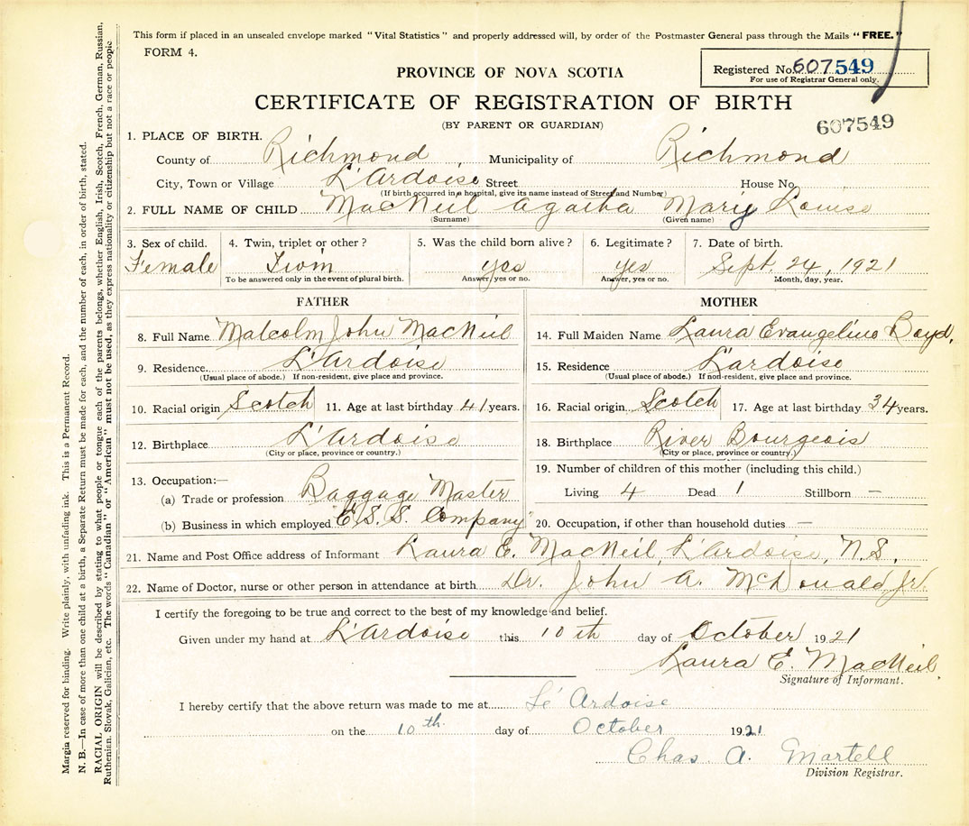 21. Name and Post Office address of Informant Laura E. MacNeil L'Ardoise