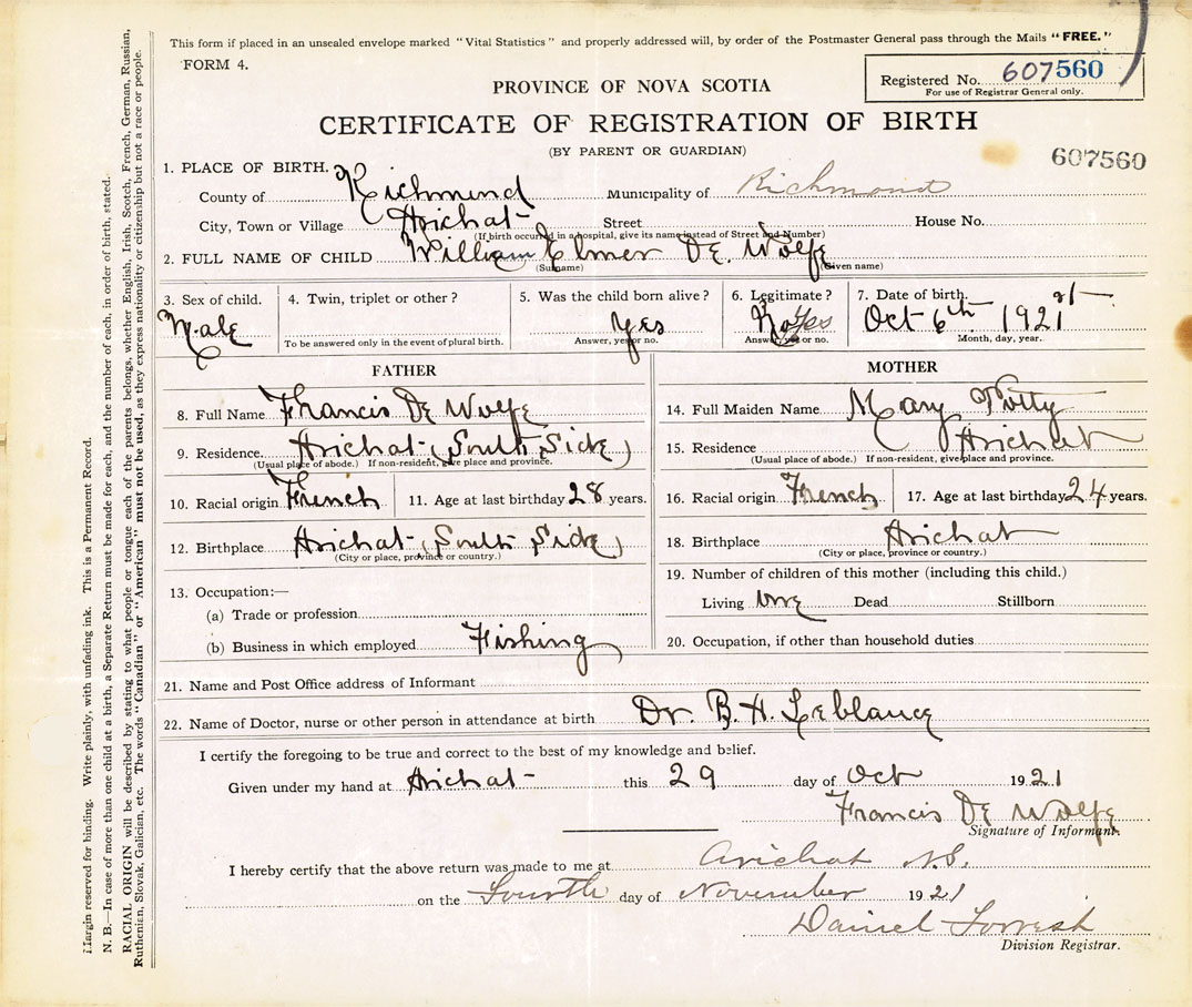 21. Name and Post Office address of Informant Francis De Wolfe Arichat