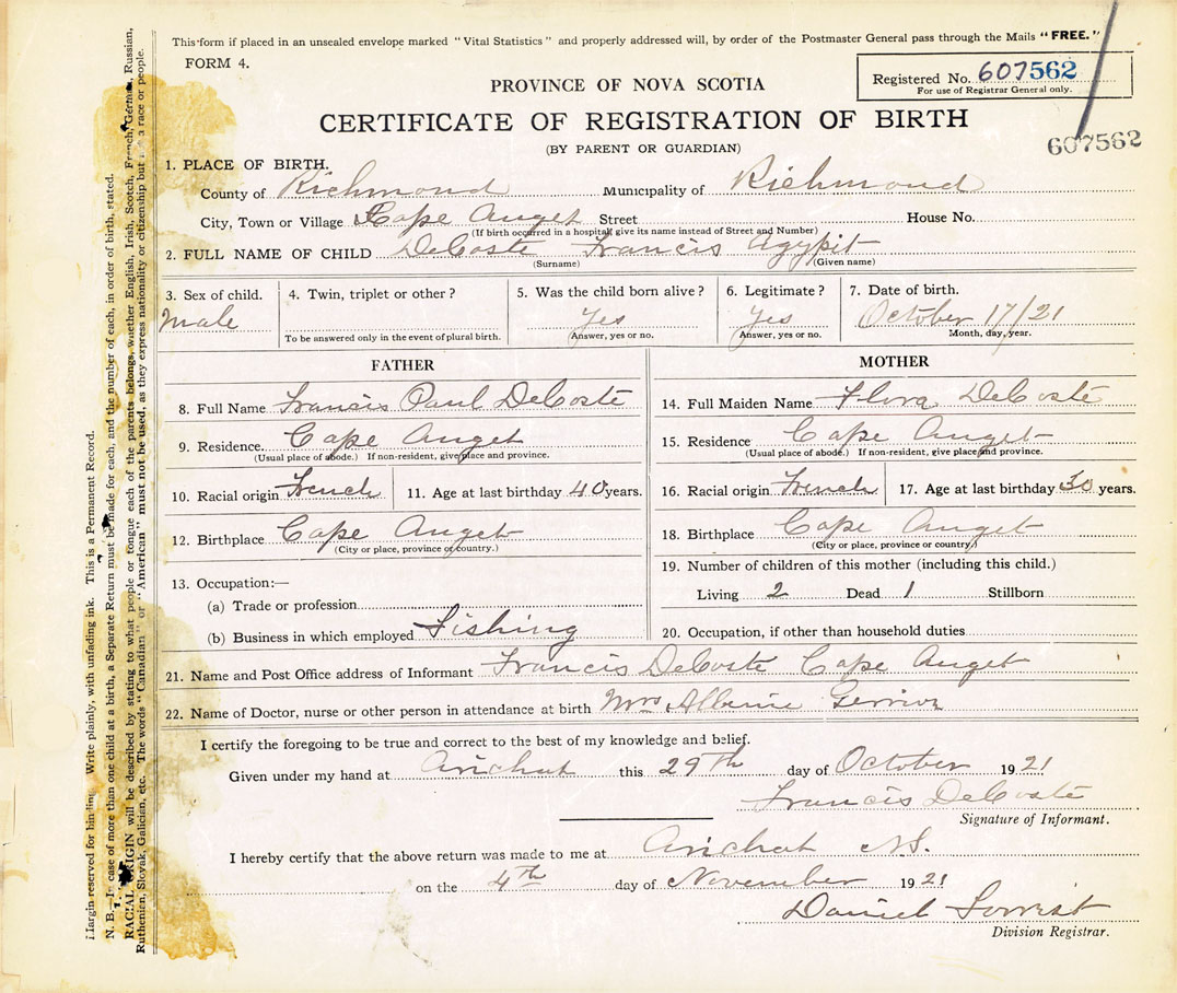 21. Name and Post Office address of Informant Francois DeCoste Cape Auget